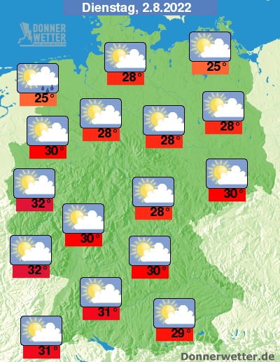 Heute ziehen gebietsweise viele und zum Teil dichte Wolken durch, sonst ist es aber oft heiter und teils auch sonnig, dabei bleibt es weitgehend trocken. Lediglich im Nordseeumfeld ist hier und da Regen möglich. Die Temperatur steigt auf 25 Grad an der See und bis 32 Grad entlang des Rheins.
