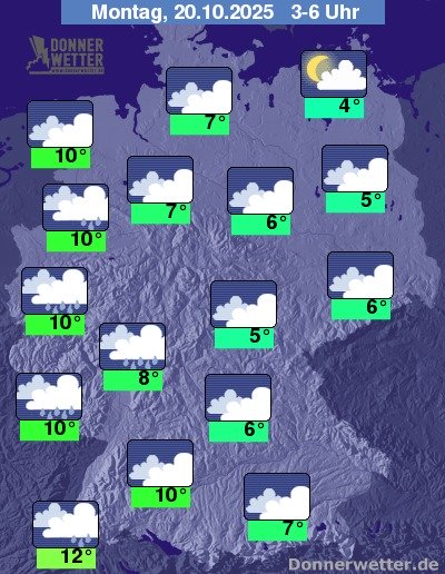 In der Nacht zum Montag ziehen kompakte Wolken in die westlichen Landesteile, die bis zum Morgen etwa die Westhälfte Deutschlands erreichen, dabei fällt zeitweise Regen. Weiter nach Osten hin ist es stark, meist dicht bewölkt, jedoch bleibt es über der Osthälfte weitgehend trocken. Die Temperatur sinkt auf 12 Grad in Freiburg und bis 4 Grad in Neubrandenburg.