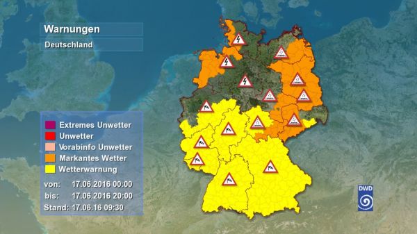 Auch für heute Nachmittag und Abend liegen wieder Warnungen des Deutschen Wetterdienstes vor. In weiten Teilen Ostdeutschlands ist mit Stark- und Dauerregen und teils kräftigen Sturmböen zu rechnen. Lokal werden bis zu 40 Liter Niederschlag pro Quadratmeter und Windgeschwindigkeiten bis zu 60km/h erwartet. Für den äußersten Nordwesten besteht zudem eine Warnung vor starken Gewittern mit ergiebigem Regen.