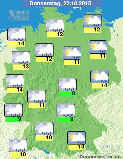 Am Donnerstag ist es anfangs im Süden und Osten noch oft locker oder aufgelockert bewölkt und trocken. Im übrigen Bundesgebiet ziehen hingegen schon verbreitet dichte Wolken durch und es fällt zeitweise Regen. Im Tagesverlauf breiten sich die Regenwolken auch auf die übrigen Landesteile aus. Die Temperatur steigt auf 8 Grad im Grabfeld und bis 14 Grad im Rheinland.