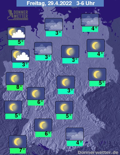 In der bevorstehenden Nacht funkeln über dem Land verbreitet die Sterne von einem überwiegend wolkenlosen Himmel. Am ehesten ziehen im Nordwesten bzw. an der Nordsee ein paar Wolken durch. Es bleibt trocken bei Tiefstwerten von 8 Grad in Köln und 3 Grad in Wolfsburg.