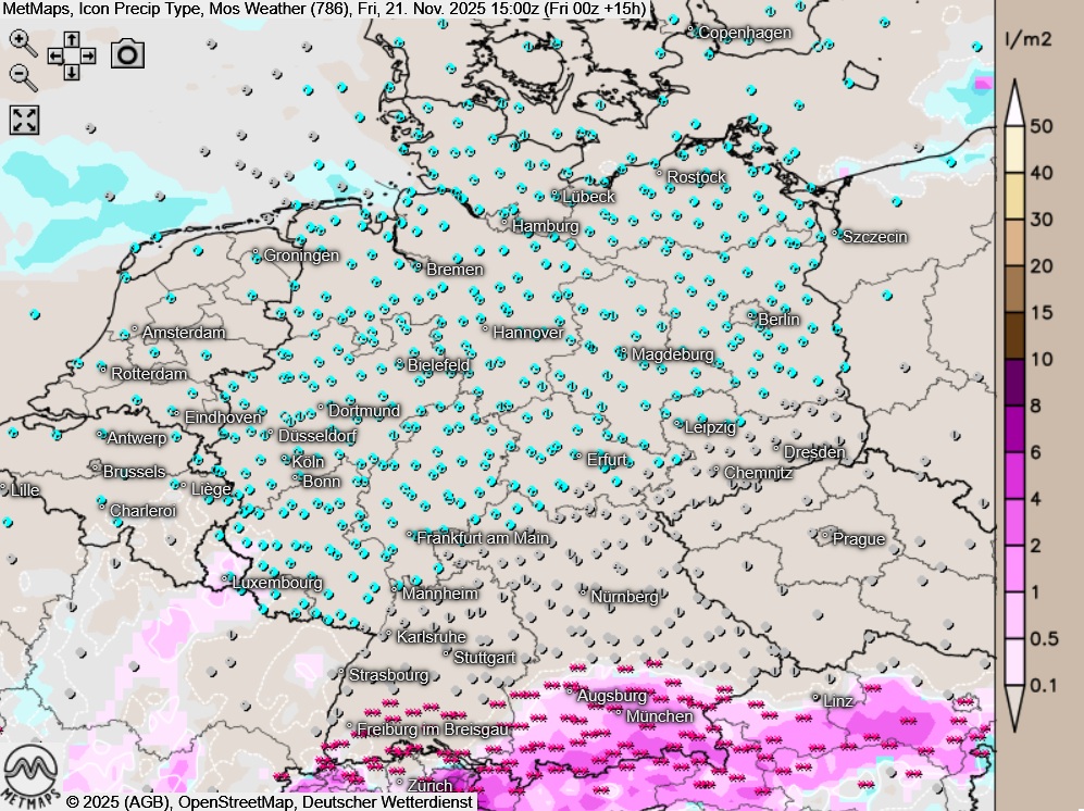 Die Temperatur- und Niederschlagstypkarte für Freitagnachmittag (15:00 Uhr) nach Icon: