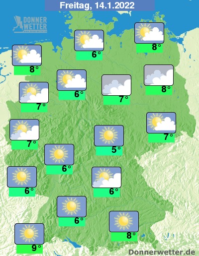 Die Temperaturen erreichen im Tagesverlauf Höchstwerte um 5 Grad in Erfurt, 6 Grad an der Weser und um 9 Grad am Hochrhein.