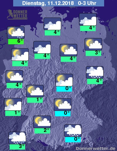 In der Nacht auf Dienstag zeigt sich der Himmel mal bedeckt, später auch häufig locker oder aufgelockert bewölkt. Mit Niederschlägen muss zunächst vor allem noch an der Nordseeküste und südlich der Donau gerechnet werden, im weiteren Verlauf regnet, schneeregnet oder schneit es hauptsächlich entlang der Oder.