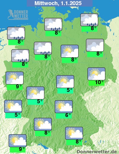 Am heutigen Neujahrstag zeigt sich der Süden häufig heiter und trocken. Im übrigen Bundesgebiet ist es hingegen überwiegend trüb oder stark bewölkt, im Norden fällt zudem gebietsweise Regen, sonst bleibt es weitgehend trocken. Die Temperatur erreicht 5 Grad im Eichsfeld und bis 10 Grad in der Niederlausitz. Über der Nordhälfte weht ein oft stürmischer Wind, an der See herrscht sogar verbreitet Sturm.
