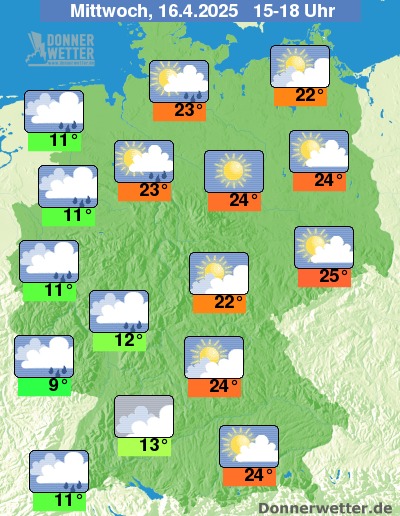 Am Mittwochnachnmittag zeigt sich der Himmel über dem Westen und Südwesten stark bewölkt oder es ist bedeckt, dabei fällt zeitweise Regen. In der Mitte des Landes muss mit einzelnen Schauern und Gewittern gerechnet werden. Im Osten und Südosten verläuft der Nachmittag heiter oder es ist sonnig.