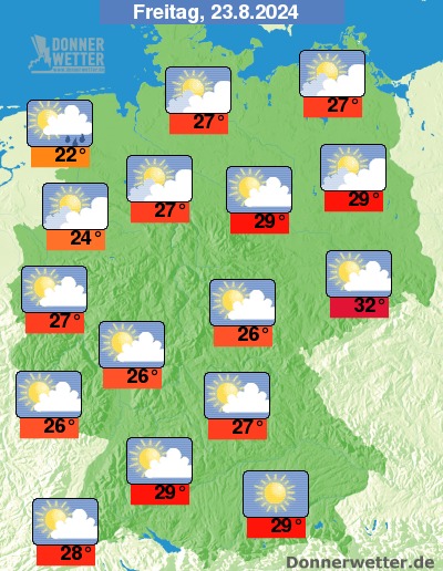 Die Temperaturen erreichen Höchstwerte um 22 Grad an der Nordseeküste und 32 Grad in der Lausitz.