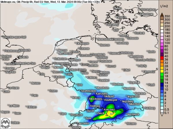 Auch der Mittwoch bleibt vor allem in den südlichen Landesteilen und zumindest zeitweise nass - die Karte zeigt die zu erwartenden Sechs-Stunden-Niederschlagsmengen bis Mittwoch 09:00 Uhr: