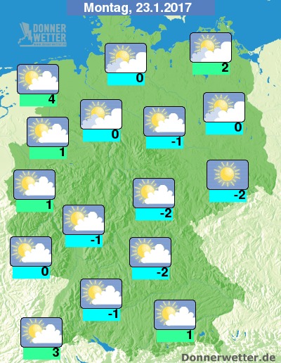 Niederschläge sind zu Wochenbeginn ebenso wenig zu erwarten wie große Sprünge bei den Tageshöchsttemperaturen: Diese liegen am Montag bei Werten um -2 Grad C im Thüringer Wald und um 4 Grad C in Ostfriesland.
