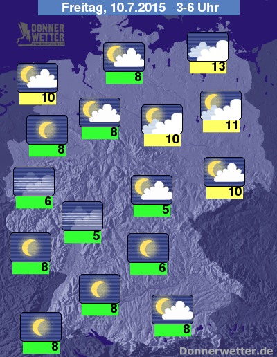 In der kommenden Nacht ist es im Norden und Osten von Deutschland oft stark und sonst meist aufgelockert bewölkt, dazu bleibt es trocken. Über der Südwesthälfte des Landes zeigt sich der Himmel hingegen verbreitet sternenklar und es bleibt ebenso trocken. Die Temperatur sinkt auf 13 Grad in Vorpommern und bis 5 Grad am Odenwald.