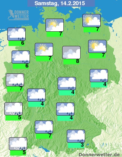 Am Sonntag lässt sich im Norden und Osten häufig die Sonne blicken und es bleibt überwiegend trocken, sonst zieht dagegen oft starke Bewölkung durch und es kann immer wieder etwas Regen, Schneeregen oder Schnee fallen. Es sind jedoch auch Auflockerungen möglich. Die Temperatur steigt auf teils nur 2 Grad am Alpenrand und bis 8 Grad im Ruhrgebiet.