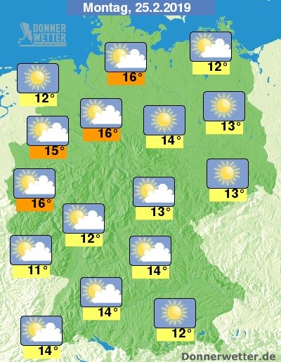 Am Montag ist es heiter bis sonnig, hier und da können auch einige Wolken durchziehen, dabei bleibt es aber trocken. Die Temperatur erreicht 11 Grad am Pfälzer Wald und bis 16 Grad im Ruhrgebiet.