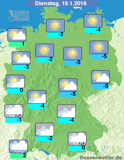 Am Dienstag ziehen im Südwesten und im Alpenvorland dichte Wolken durch und es kann zeitweise schneien, örtlich ist auch Schneeregen möglich, dabei besteht erhöhte Glättegefahr! Nördlich des Mains ist es dagegen meist heiter bis sonnig und es bleibt dabei trocken. Hier und da sind aber auch mal mehr Wolken möglich. Die Temperatur steigt auf -5 Grad in Berlin und bis 2 Grad in Freiburg.