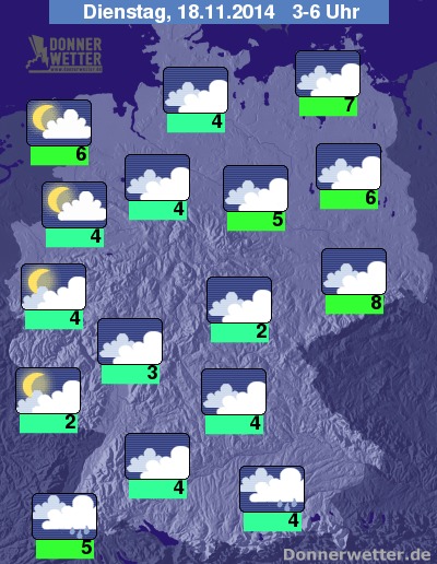 In der Nacht zum Dienstag zieht sich der Himmel auch in den übrigen Landesteilen meist zu, überwiegend aufgelockert oder stark bewölkt bleibt es in einem breiten Streifen vom Saarland bis hoch zur Nordsee. Es bleibt weitgehend trocken, vor allem am Alpenrand, im Südosten des Landes und gegen Morgen auch im Osten des Landes fällt jedoch zeitweise, meist leichter Regen. Nur vereinzelt kann sich Nebel oder Hochnebel bilden. Die Temperatur sinkt auf 8 Grad in Dresden und etwa 2 Grad in der Südeifel.