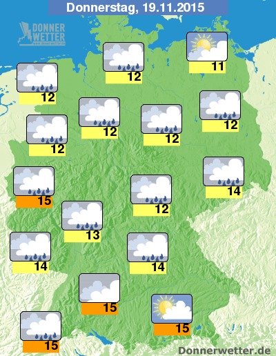 Am Donnerstag ziehen in einer westlichen Strömung meist dichte Wolken übers Land, dabei bleibt es zunächst noch größtenteils trocken. Erst im Nachmittagsverlauf breiten sich von Westen her dichte Regenwolken mit teils kräftigem und langanhaltendem Regen nach Osten hin aus. Die Temperatur steigt auf 11 Grad an der Müritz und bis 15 Grad im Oberrhreingraben. Es weht oft starker, im Norden verbreitet stürmischer Wind. An den Küsten und in den Hochlagen der norddeutschen Mittelgebirge herrscht Sturm.