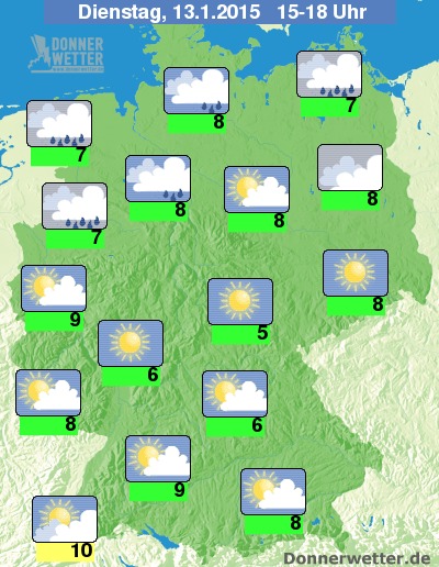 Heute Nachmittag halten sich im Norden und Nordwesten meist dichte Wolken und es fällt zum Teil kräftiger Regen. Weiter südlich ist es hingegen verbreitet freundlich und trocken, vielerorts ist es sogar sonnig. Die Temperatur liegt bei 5 Grad im Coburger Land und um 10 Grad im Breisgau. An den Küsten weht ein zum Teil starker Wind mit stürmischen Böen.