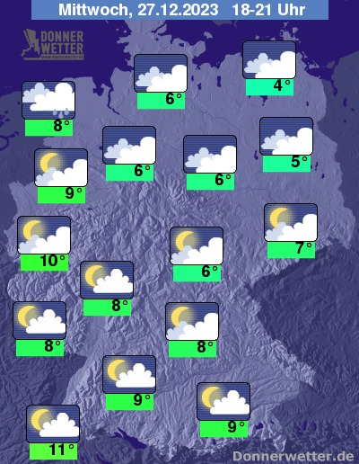 Heute Abend ist es im Süden vielerorts nur locker bewölkt, weiter nach Norden hin nimmt die Bewölkung zu und über der Nordhälfte des Landes ist es weitgehend stark bewölkt oder trüb. Im Umfeld von Nord- und Ostsee ist dabei auch etwas Regen möglich, sonst bleibt es weitgehend trocken. Die Temperatur liegt bei 4 Grad in Vorpommern und rund 11 Grad im Breisgau. Im Norden und Nordwesten weht ein zunehmend starker Wind. An der Ostsee ist es teils stürmisch, an der Nordsee herrscht zunehmend Sturm, hier sind schwere Sturmböen möglich.