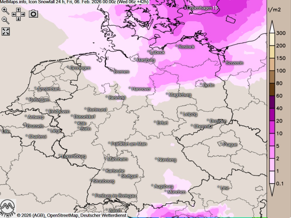 Die Temperatur- und Wetterkarte für Donnerstagfrüh (06:00 Uhr) sowie die 24-Stunden-Schneemengen für Donnerstag nach ICON: