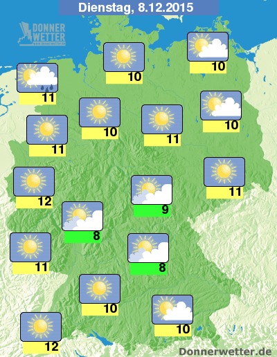 Am Dienstag hält sich anfangs noch stellenweise Nebel oder Hochnebel und es ist teils trüb, meist setzt sich aber rasch die Sonne durch und vor allem am Nachmittag ist es über weiten Teilen Deutschlands auch wolkenlos. Gegen Abend können in den westlichsten Landesteilen dichte Wolken aufziehen, dazu bleibt es aber noch weitgehend trocken. Die Temperatur steigt auf 8 Grad in Unterfranken und bis 12 Grad im Rheinland.