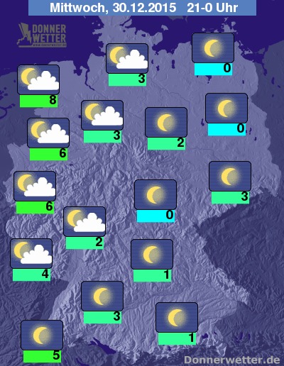 In der Nacht zum Donnerstag bleibt es im Osten und Südosten bis zum Morgen meist sternenklar, im Norden und Westen ist es zunächst meist locker bis aufgelockert bewölkt und trocken. Im Laufe der zweiten Nachthälfte ziehen dort zunehmend dichte Wolken auf und gegen Morgen setzt in den westlichen Landesteilen Regen ein, der sich bis zu einer Linie vom Schwarzwald bis zur Nordsee ausbreitet, weiter nach Osten bleibt es noch trocken. Die Temperatur sinkt auf 6 Grad in Ostfriesland und bis etwa -1 Grad im Grabfeld. An den deutschen Küsten weht ein oft starker und teils stürmischer Wind.