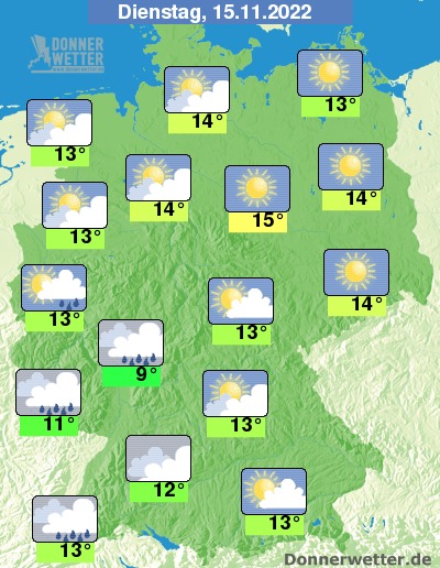 In der Nacht zum Dienstag bringen dichte Wolken vom Oberrhein bis zum Rheinland gebietsweise Regen. Vom Niederrhein bis ins Emsland ziehen auch mehr Wolken auf, wobei es hier weitgehend trocken bleibt. Im übrigen Land zeigt sich der Himmel verbreitet nur locker bewölkt oder sternenklar, dazu bleibt es trocken. Die Temperatur sinkt auf 11 Grad in der Kölner Bucht und bis etwa 3 Grad in Berchtesgaden.