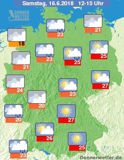 Heute Nachmittag ist es über dem Süden und Osten noch verbreitet heiter oder sonnig und dazu auch weitgehend trocken. Im übrigen Land ziehen hingegen mehrheitlich dichte Wolken übers Land hinweg, die auch einzelne Schauer und örtlich auch Gewitter bringen. Die Temperatur liegt bei 18 Grad in Cuxhaven und bis 27 Grad in Dresden.