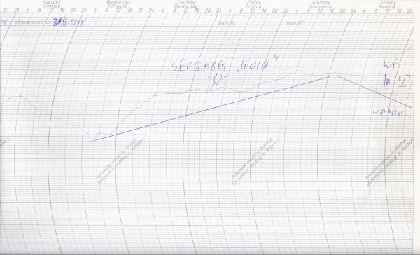 Unser Schrieb zeigt den Luftdruckverlauf zwischen dem 27.08. und 02.09.2018 an unserer Wetterstation in Bonn.