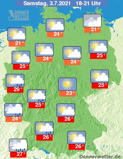 Heute Abend ziehen vom Ober- bis zum Mittelrhein oft kompakte Wolken auf, die hier gebietsweise Schauer und auch vereinzelte Gewitter bringen. An der Ostsee bilden sich bei häufig starker Bewölkung ebenfalls gebietsweise Schauer. Im übrigen Land ist es meist heiter und zum Teil sonnig und dabei auch trocken. Die Temperatur liegt bei 21 Grad in Rostock und bis 29 Grad in Köln.