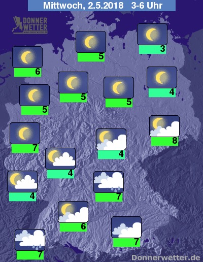 In der folgenden Nacht zeigt sich der Himmel nördlich einer Linie vom Saarland bis nach Berlin weitgehend sternenklar. Im Süden bringen dichte Wolken hingegen hier und da etwas Regen, sonst ist es meist aufgelockert bewölkt und trocken. Die Temperatur sinkt auf 8 Grad in Dresden und bis 3 Grad in Rostock.
