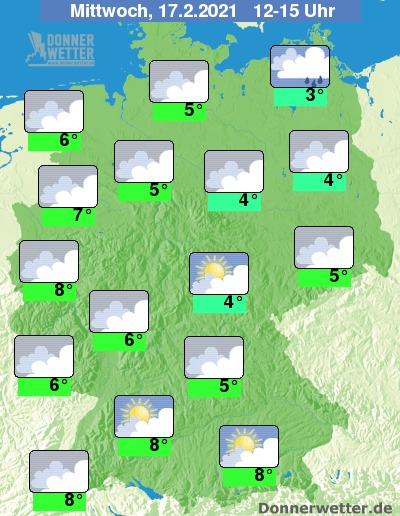 Heute Nachmittag ist es häufig stark, hier und da und besonders im Süden aber auch locker bis aufgelockert bewölkt. Es bleibt verbreitet trocken bei Werten von 3 Grad in Stralsund und etwa 8 Grad in München.