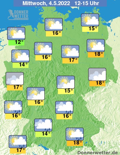 Heute Nachmittag ist es im Süden verbreitet stark, teilweise auch aufgelockert bewölkt, dabei bilden sich gebietsweise Schauer, örtlich sind zudem Gewitter möglich. Im übrigen Bundesgebiet ist es wechselnd bis aufgelockert und nur zum Teil auch stark bewölkt, dabei bleibt es weitgehend trocken. Die Temperatur liegt bei 12 Grad an der Nordsee und etwa 18 Grad in der Lausitz.