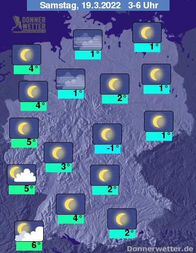 In der kommenden Nacht zeigt sich der Himmel über Deutschland weitgehend sternenklar. Entlang des Ober- und Mittelrheins sind auch mal einige Wolken möglich. Es bleibt überall trocken bei Tiefstwerten von 6 Grad in Freiburg und bis -1 Grad in Jena.
