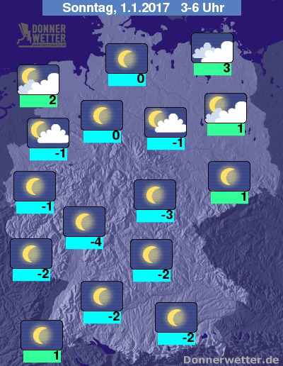 Am Neujahrstag scheint von der breiten Landesmitte bis in den Süden Deutschlands verbreitet die Sonne bei höchstens lockerer Bewölkung. Mehr und zunehmend auch dichte Wolken ziehen über den Norden und Nordwesten des Landes hinweg. Vom Niederrhein bis nach Schleswig-Holstein kann es zum Abend hin auch regnen, im übrigen Bundesgebiet bleibt es weitgehend trocken. Die Temperatur steigt auf 2 Grad am Westerwald und bis 7 Grad im Breisgau.