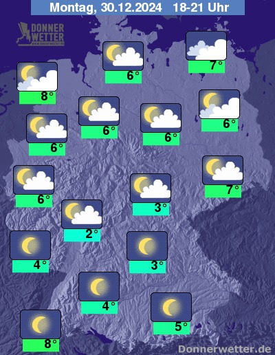 Heute Abend ist der Himmel über dem Süden Deutschlands meist sternenklar, im übrigen Land ist es teils locker, teils aber auch stärker bewölkt, jedoch bleibt es überall trocken. Die Temperatur liegt bei 2 Grad am Teutoburger Wald und 8 Grad an der Nordsee.