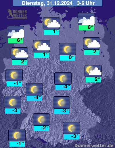 In der Nacht zum Dienstag hält sich über dem Norden häufig dichte Bewölkung, hier und da ist es hier aber auch aufgelockert bewölkt. Im großen Rest des Landes ist es weitgehend sternenklar. Es bleibt landesweit trocken bei Tiefstwerten von 6 Grad an der See und bis -4 Grad im Thüringer Becken.