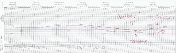 Der Schrieb zeigt den Luftdruckverlauf zwischen dem 27.03. und 03.04.2017 an unserer Wetterstation in Bonn: