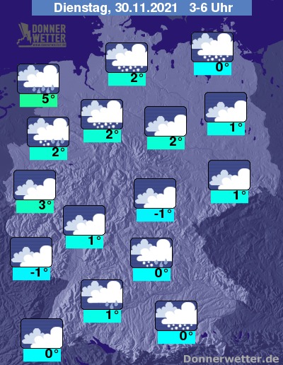 In der Nacht zum Dienstag fällt im Süden weiterhin zeitweise Schnee oder Schneeregen, während es sonst zunächst weitgehend trocken bleibt. In der zweiten Nachthälfte zieht von Nordwesten jedoch teils kräftiger Schnee, Schneeregen oder Regen ein, der bis zum Morgen auch die breite Landesmitte erreicht. Die Temperatur sinkt auf 5 Grad an der Nordsee und bis -1 Grad im Grabfeld. An der Nordsee weht ein stürmischer, zum Morgen hin weht in weiten Landesteilen ein starker und teils stürmischer Wind.
