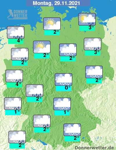 Am Montag ist es überwiegend stark oder dicht bewölkt, zum Teil ist es auch neblig-trüb. Aufheiterungen zeigen sich vor allem im Norden, hier bleibt es auch meist trocken, während im übrigen Bundesgebiet gebietsweise Schnee oder Schneeregen fällt. Die Temperatur steigt auf 0 Grad in Erfurt und bis 4 Grad in Bonn.
