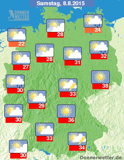 Heute ist es im Norden und Westen oft wechselnd oder stark bewölkt und es können sich lokale Schauer und auch einzelne, teils kräftige Gewitter entwickeln. Im übrigen Land ist es hingegen zumeist sonnig oder nur locker bewölkt, aber regionale Schauer und Gewitter sind trotzdem nicht auszuschließen. Dort wo Gewitter auftreten, können diese auch sehr kräftig ausfallen. Mehr Informationen über mögliche Unwetterwarnungen erhalten Sie unter www.unwetter.de! Die Temperaturen steigen auf 22 Grad in Ostfriesland und bis auf sehr heiße 38 Grad in Niederschlesien.