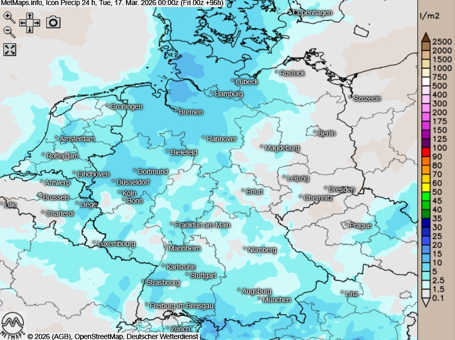 Die Wetter- und Temperaturkarte für Montagfrüh (06:00 Uhr) sowie die 24-Stunden-Regenmengen für Montag nach ICON: