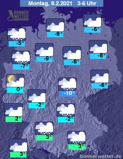 In der Nacht zum Montag bleibt es verbreitet bei dichten Wolken und auch im Süden gehen die Niederschläge immer mehr in Schnee über. Im Norden und Osten sind hier und da auch noch weitere Schneefälle möglich, zumeist bleibt es hier aber trocken. Im übrigen Bundesgebiet fällt dagegen zeitweise Schnee. Die Temperatur sinkt auf 3 Grad in Freiburg und bis auf -10 Grad im Thüringer Becken.