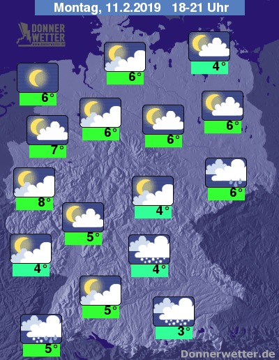 In den Abendstunden zeigt sich der Himmel zunächst überwiegend locker oder aufgelockert bewölkt, im Nordseeumfeld ist es teils auch sternenklar. Im Süden und Südosten sind die Wolken auch dichter und zeitweise fällt Regen, Schneeregen oder Schnee.