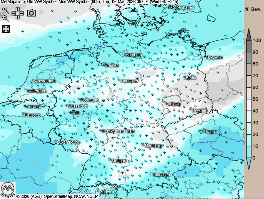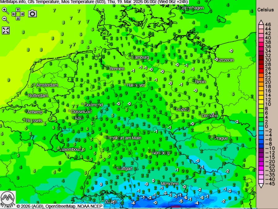 Die Wetter- und Temperaturkarte für Donnerstagmorgen (06:00 Uhr) nach GFS: