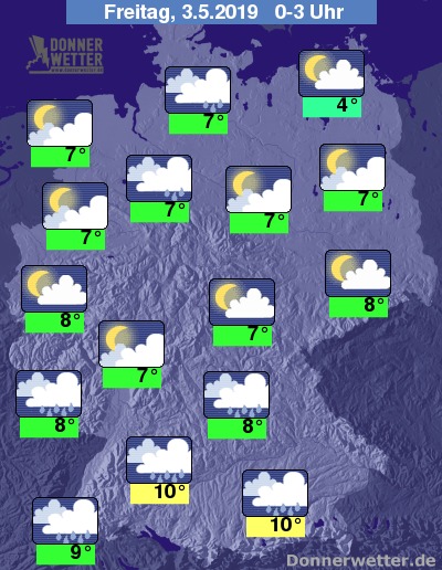 In der Nacht zeigt sich der Himmel über der Nordhälfte überwiegend bedeckt oder aufgelockert bewölkt, im äußersten Nordosten im Verlauf auch locker bewölkt, und es bleibt häufig trocken. Nur entlang der Weser können einzelne Schauer fallen. Im Süden ist es meist bedeckt und immer wieder fällt Regen.