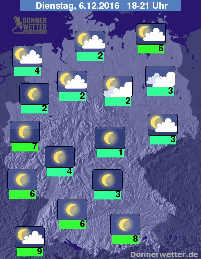 Heute Abend halten sich vom Norden bis Osten hin oft einige und zum Teil dichte Wolken, die aber keinen Niederschlag mehr bringen. Weiter nach Südwesten hin bleibt der Himmel hingegen weitestgehend sternenklar, dazu bleibt es trocken. Die Temperatur liegt bei 1 bis 9 Grad.