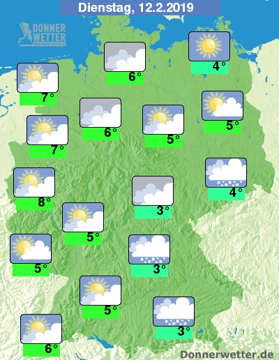 Die Temperaturen erreichen Höchstwerte um 3 Grad C im Altmühltal und um 8 Grad C im Rheinland.