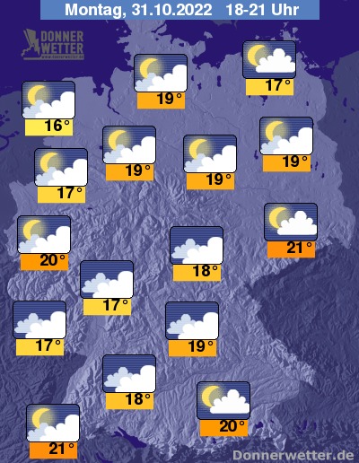 Heute Abend nimmt auch im Osten und Südosten die Bewölkung deutlich zu, sonst ist es weiterhin aufgelockert bis dicht bewölkt und zudem trocken. Die Temperatur liegt bei 16 Grad in Cuxhaven und etwa 21 Grad in Dresden.