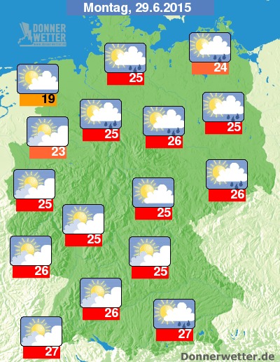 Am Montag ist es im Norden und Osten zeitweise heiter, es ziehen hier jedoch auch zum Teil kompakte Quellwolken auf, die für Schauer und auch mögliche Gewitter sorgen können. Im Süden und Westen ist es zunächst verbreitet heiter oder aufgelockert bewölkt, am Nachmittag bilden sich im Alpenvorland gebietsweise Schauer und Gewitter, sonst bleibt es aber weitgehend trocken. Die Temperatur steigt auf 19 Grad an der Nordsee und bis 27 Grad in München.