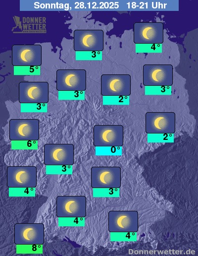 In der Nacht zum Montag ziehen im Osten und Norden gebietsweise dichte Wolken durch, es bleibt hier aber von seltenen Tropfen abgesehen weitgehend trocken. Im großen Rest der Republik ist der Himmel überwiegend sternenklar und es bleibt komplett trocken. Die Tiefstwerte liegen bei 3 Grad in Wilhelmshaven und bis -6 Grad in Nürnberg.