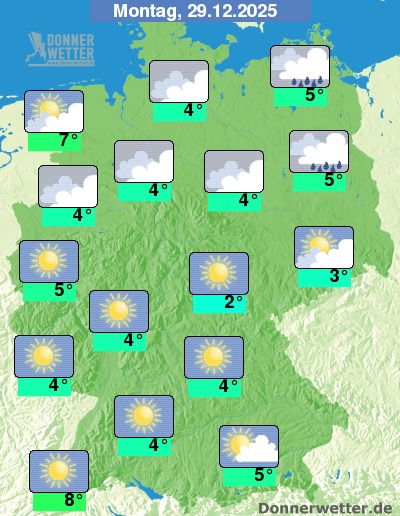 Am Montag ist es über der Nordhälfte, insbesondere aber über dem Norden Deutschlands meist trüb oder bedeckt, dabei kann gelegentlich auch Regen fallen. Im übrigen Land ist es dagegen meist sonnig oder es ziehen nur lockere Wolkenfelder durch, dabei bleibt es trocken. Die Temperatur steigt auf 2 Grad im Eichsfeld und bis 8 Grad am Oberrhein.